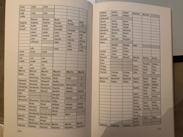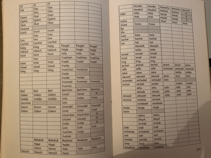 Die Nationalsozialisten räumten in der Wahl der akzeptierten Vornamen kräftig auf. Bereits am 8. Februar 1938 begann man damit, eine Liste zu erstellen, welche Vornamen zukünftig von Juden getragen werden mussten. Hitler bemerkte zu dieser Liste, dass nur solche wirklich jüdischen Vornamen gestattet werden, «die von Deutschen nicht geführt werden und ihrem Klang nach ohne Weiteres als jüdisch zu erkennen sind.»[1] Hingegen liess er Namen streichen, die auch in «deutschen Familien durchaus üblich sind.»[2] Am 18. Mai desselben Jahres gab es die zweite revidierte Liste, auf der sich 190 männliche und 121 weibliche Namen befanden. Dazu bemerkte die Reichskanzlei «… wenn auch einige Namen dabei sein mögen, die auch (ganz) vereinzelt in deutschen Familien vorkommen, wie z.B. Elias, Isidor, Samuel, Deborah. Das wird sich aber kaum ganz vermeiden lassen, da sonst zu wenig Namen für die Juden verbleiben.»[3] Die letzte und damit endgültige Fassung erschien, nachdem Hitler selber nochmals 19 Mädchennamen gestrichen hatte, am 18.8.1938. Jüdische Eltern konnten nun zwischen 185 männlichen und 91 weiblichen Vornamen wählen. Bereits lebende Juden, die keinen der erwähnten Namen trugen, mussten ab diesem Zeitpunkt den Zusatznamen «Israel» bzw. «Sarah» führen.
