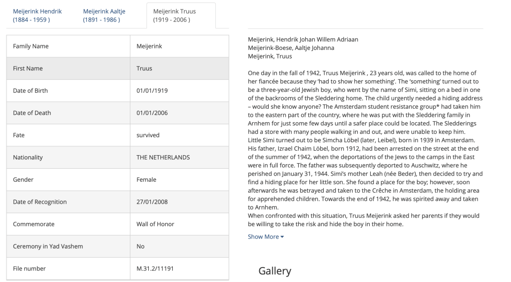 Simi Liebel, niederländisch-israelischer Staatsbürger wurde während drei Jahren in Arnhem/Niederlande von Truus Meijerink und ihrer Familie versteckt. Nicht nur Simi Liebel überlebte, sondern auch seine Mutter, die ebenfalls ein Versteck gefunden hatte. Mutter und Sohn wanderten nach dem damaligen Palästina aus. Ein von Simi Liebel in niederländischen Zeitungen geschaltetes Suchinserat stellte den Kontakt nach vielen Jahren wieder her.