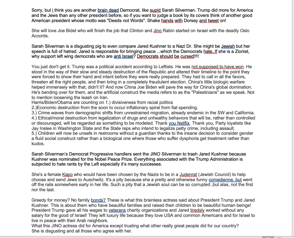 Politisch andersdenkende Kommentatoren werden systematisch aufs unglaublichste beleidigt und beschimpft, in weitaus schlimmerem Masse, als es Sarah Silverman jemals einfallen würde.