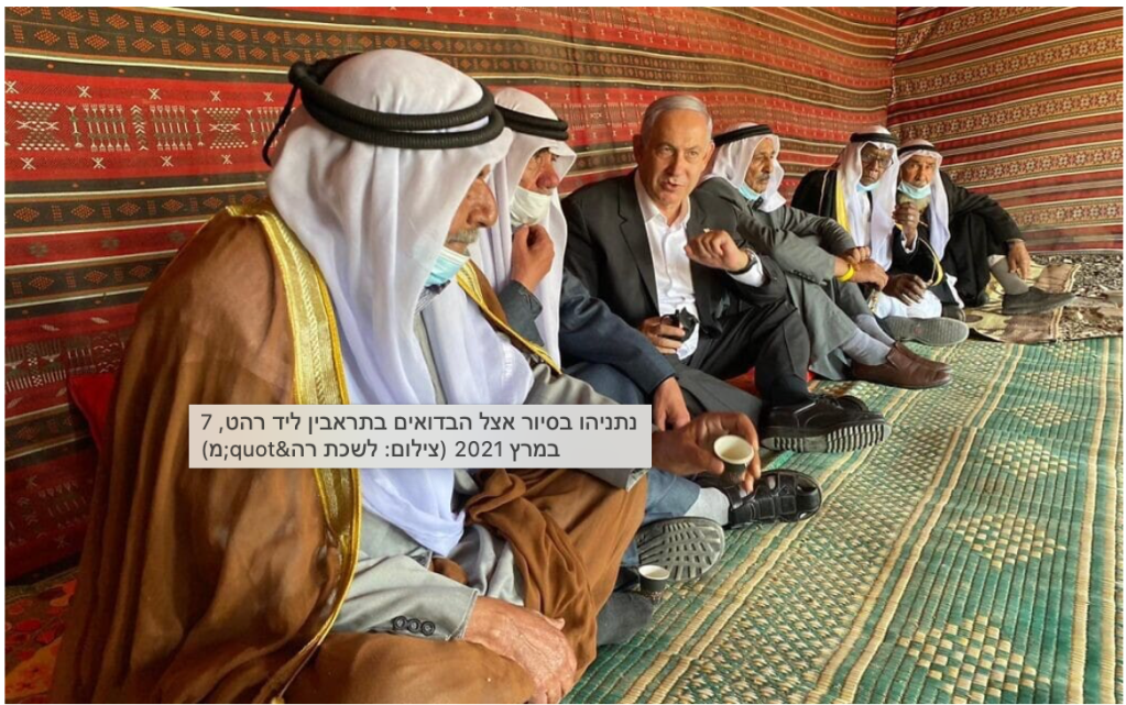So ähnlich hatte sich auch Netanyahu bei seinem überraschenden Besuch bei den Beduinen am 7. März 21 geäussert. «Ich werde die Probleme der Beduinen zu meinem Anliegen machen und mich selbst darum kümmern. (Wörtlich sagte er: zur Sache des Büros des PM machen.)[1]
