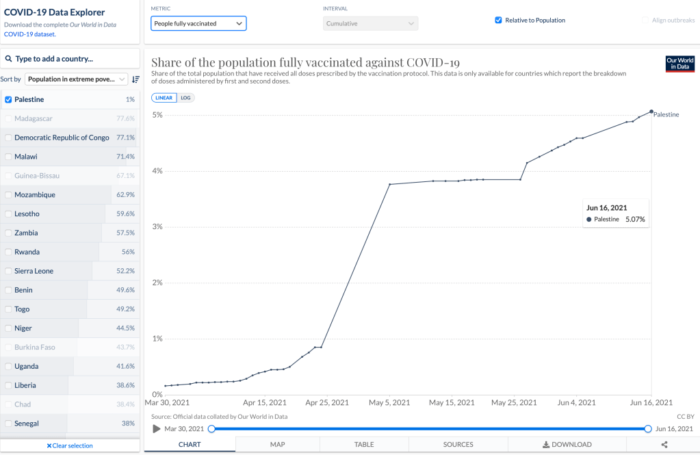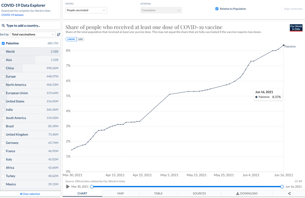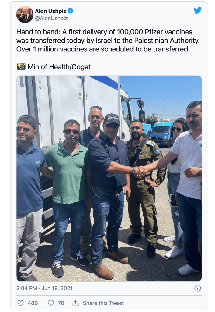 Am vergangenen Freitag, 18.Juni wurde vereinbart, dass bis zu 1.4 Millionen Dosen des Pfizer Impfstoffes nach Ramallah geliefert werden würden. Eine erste Teillieferung von 100.000 Dosen wurde sofort ausgeliefert. Möglich wurde dieser Handel, weil Israel derzeit über viel mehr Impfdosen verfügt, als verimpft werden können. Die den Palästinensern zur Verfügung gestellten Vaccine hätten ein Ablaufdatum zwischen Ende Juni und Ende August.