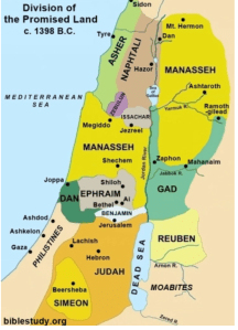 Der Stamm Levi blieb von dieser Verteilung ausgeschlossen. Bedingt durch das ewige Priesteramt gelten sie nicht als einer der zwölf Stämme Israels, sondern nehmen eine Sonderstellung ein. Sie lebten ausschliesslich von den Tempelabgaben. Josef stirbt bereits vor der Flucht aus dem Exil, deshalb wird der Erbbesitz seinen zwei Söhnen Menasche und Ephraim zugesprochen. Wer in welchem Teil des neuen Landes siedeln sollte, wurde per Los entschieden.