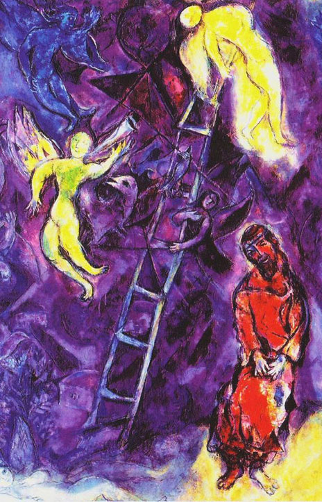 In der ersten Nacht träumt er den Traum, der als „Jakobsleiter“ auch ausserhalb der Thora bekannt wurde. Eine Leiter verbindet den Boden, auf dem Jakob ruht, mit dem Himmel. Ganz oben steht Gott und schaut auf Jakob hinunter. Engel steigen auf der Leiter hinauf und hinab. Eine Leiter hat niemals etwas Trennendes an sich, sie ist immer Verbindung zwischen zwei Ebenen, eine Hilfe, um ein Ziel zu erreichen.