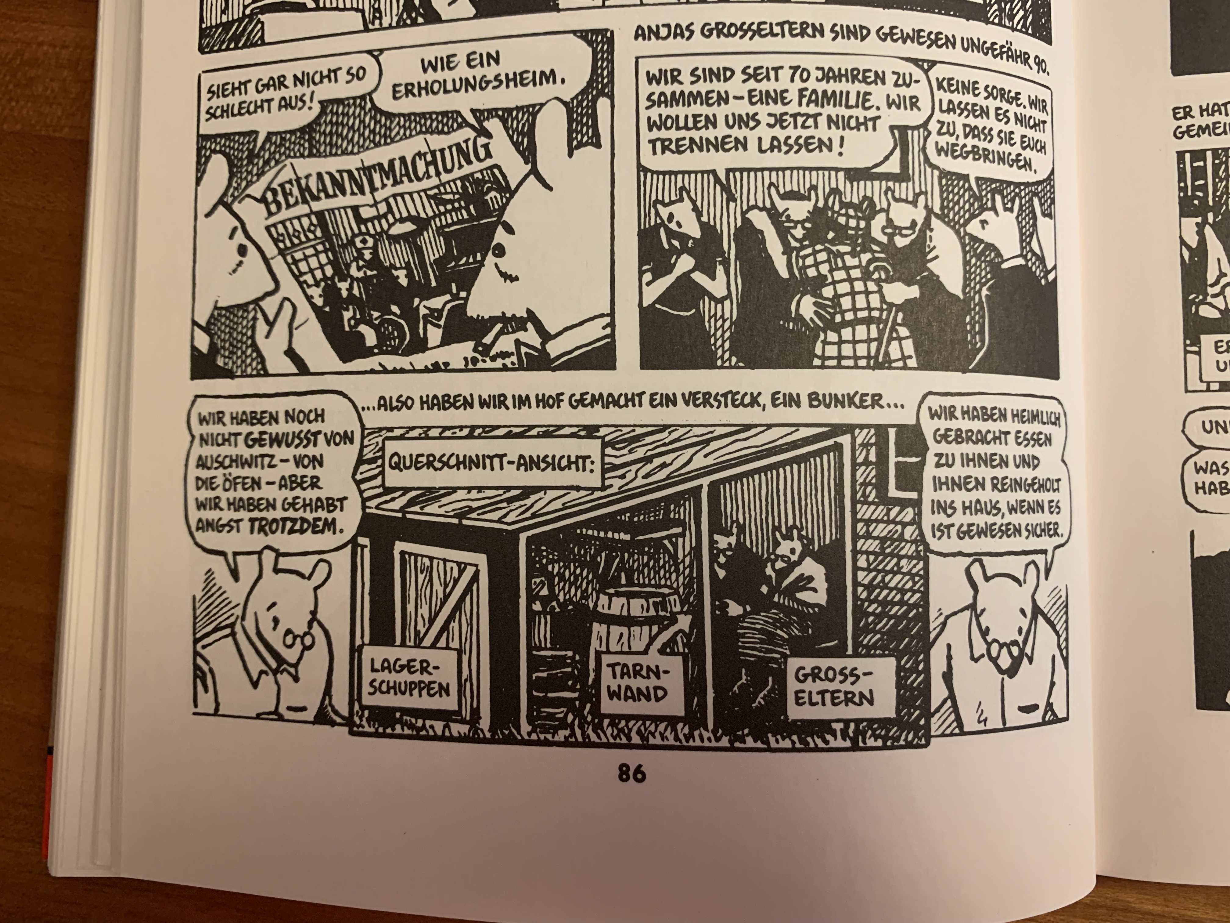 Kein Comic zum Lachen, noch nicht einmal zum Schmunzeln. Ein Comic zum Lernen. Durch die Verfremdung der Menschen in Tiere gelingt es Art Spiegelman, einen deutlichen Abstand zum Geschehen herzustellen und es nicht zu nah an sich, aber auch nicht an die Leser herankommen zu lassen. Kein Comic für Kinder. Nichts ist niedlich, nichts ist bunt. Oft sehr dunkel wirkendes Schwarz-weiss. Es ist ein Comic, den man Jugendlichen in die Hand geben möchte. Dann, wenn «Schindlers Liste» zu populär und «Wir weinten tränenlos»[1](Augenzeugenberichte des jüdischen «Sonderkommandos» in Auschwitz) oder viele andere authentische Bücher über den Holocaust zu angstmachend sind. Aufklärung soll nicht ängstigen, Aufklärung soll falsche Bilder im Kopf wieder geraderücken.