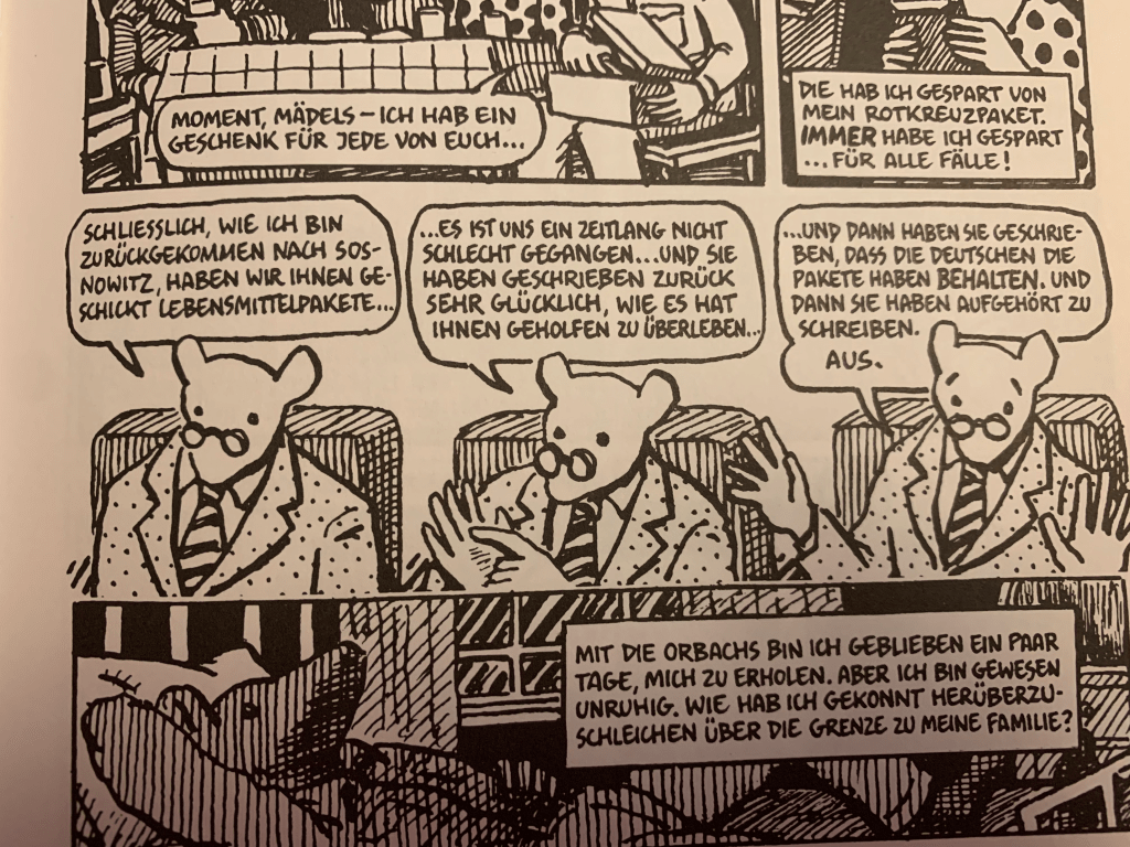 1989 veröffentlichte er Maus I. Hier beginnt der zweite Handlungsstrang. Der Vater erzählt seine Lebensgeschichte während der Zeit des Nationalsozialismus, beginnend mit der Zeit Mitte der 30-er Jahre bis zum Ende der Nazi Zeit. Nach einer glücklichen Zeit in der jungen Ehe leidet Anja nach der Geburt ihres ersten Kindes unter postnatalen Depressionen. Gemeinsam mit Wladek verbringt sie drei Monate in einer noblen Klinik in der bereits von Deutschen besetzten Tschechoslowakei.