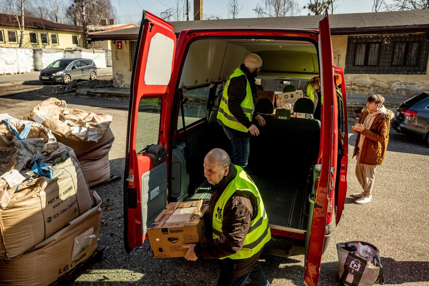 Vor der Abfahrt nach Osten beladen sie den Ford Transit mit allen Sachspenden, die in den letzten Tagen für sie abgegeben wurden. Wolldecken, Kleider, Thermomatten, Hygieneartikel, Babynahrung, Trockennahrung, Schokolade, Handtücher, Jodsalz aber auch Coronatests. Einfach alles, was gerade abgegeben wurde. In der Ukraine wird derzeit alles gebraucht.