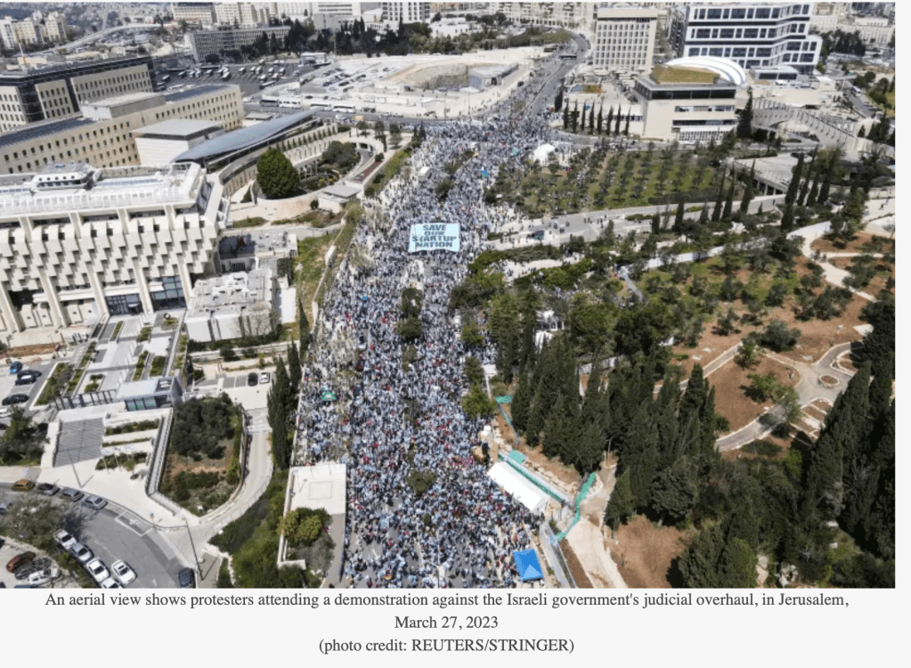 Die Siedlergemeinschaften von Judäa und Samaria haben angekündigt, sich nicht dem landesweiten Streik anzuschliessen, sondern wie an jedem Tag, jede Versorgung in allen Bereichen aufrecht zu erhalten. Der Bürgermeister von Efrat forderte ein Referendum. Beide Seiten sollten ihre Ansichten darin aufzeigen und dem Wahlvolk die Abstimmung dazu überlassen. «Die Krise, die Demonstrationen gegen die Reform und die heute Abend geplanten zu ihrer Unterstützung – zusammen mit den politischen Umwälzungen – erfordern die Durchführung eines Referendums über ein Konzept, das von der Koalition vorgelegt wird, und ein Konzept, das von der Opposition vorgelegt wird. Es gibt derzeit keine andere Option auf dem Tisch, die das Unheil stoppt.»