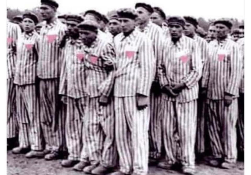 Ein schöner Text, aber das Bild ist eine primitive Fälschung! Das Originalbild auf der Webseite des KZ-Buchenwald zeigt ganz deutlich, dass die Häftlinge einen rosaroten Wimpel auf der Kleidung trugen und damit als homosexuell gebrandmarkt wurde.