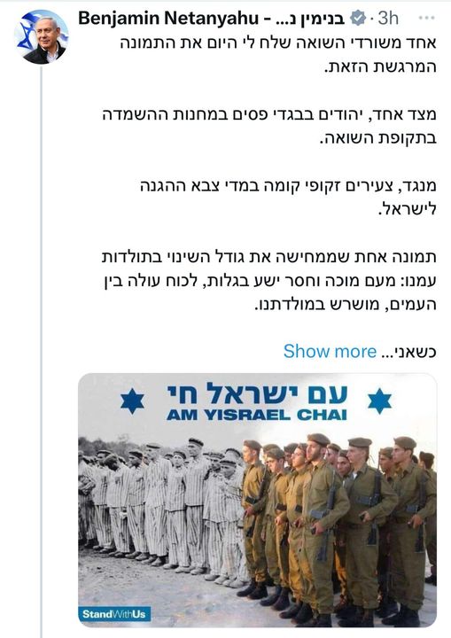 Pünktlich knapp vor Yom HaShoa veröffentlichte PM Netanyahu in seinem privaten Twitter Account eine Bildmontage. Ursprünglich war das «Bild» von «Stand with us», einer NGO, verbreitet worden. Mittlerweile wurde es allerdings von deren Facebook Seite entfernt. Die Übersetzung des Twitter Textes lautet: «Ein Holocaust-Überlebender hat mir heute dieses bewegende Bild geschickt. Einerseits Juden in gestreifter Kleidung in den Vernichtungslagern während des Holocaust. Auf der anderen Seite hochgewachsene junge Männer in Uniform der israelischen Streitkräfte. Ein Bild, das das Ausmass des Wandels in der Geschichte unserer Nation veranschaulicht: von einem geschundenen und hilflosen Volk im Exil zu einer aufstrebenden Macht unter den Nationen, die in unserer Heimat verwurzelt ist.