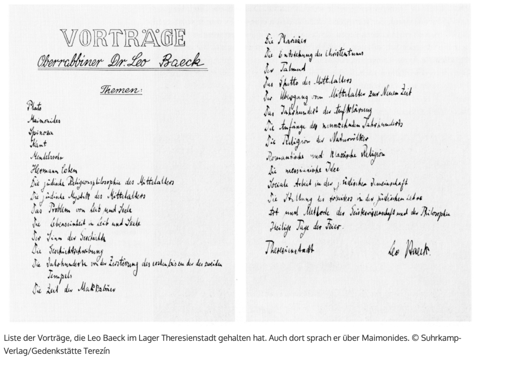 Im Januar 1943 wurde Leo Baeck in das KZ Theresienstadt deportiert. Aufgrund seines hohen Bekanntheitsgrades und wahrscheinlich auch als «Feigenblatt» zur Verschleierung der tatsächlichen Vorgänge im Lager genoss er dort zunächst einige Vorrechte. Er versuchte, mit den einfachen Mitteln, die ihm zur Verfügung standen, eine Art Gemeindeleben aufrechtzuerhalten und trug viel zu den von den Nazis geforderten und geförderten Kulturveranstaltungen bei. Die Liste seiner Vortragsreihe ist erhalten und legt Zeugnis ab über sein umfangreiches Wissen. Neben den jüdischen Gelehrten referierte er auch über Platon, Kant und andere.