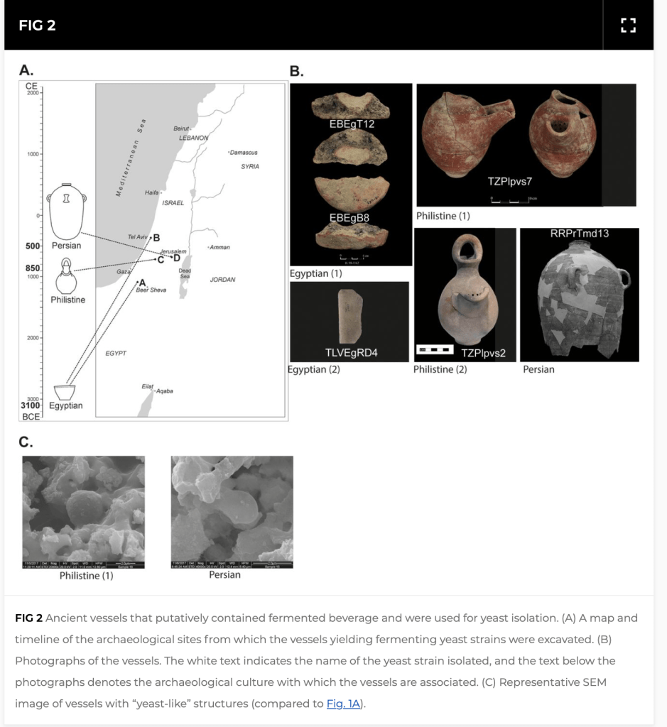 In Abydos, einem der ältesten Orte des alten Ägypten, wurden die Überreste von etwas ausgegraben, was der Vorläufer einer Bierbrauerei sein könnte. Die Archäologen datieren die Funde auf eine Zeit zwischen 3.100 und 2.700 BCE. Auch die Braumeister der damaligen Zeiten wussten schon, dass zuerst gebacken und dann gebraut werden musste. Bis zu 22.000 Liter pro Befüllungen konnten die «Braukessel» aus Ton pro Befüllung brauen. Das Bier dürfte für Opferrituale und den Hof des Pharaons hergestellt worden sein. Den Forschungen in Ägypten folgten Forschungen in Israel. Die Ausgrabungsorte befanden an vier Orten aus verschiedenen Epochen. Den Wissenschaftlern gelang es, sechs Stämme des berauschenden einzelligen Pilzes aus 21 Keramikstücken der biblischen Tell es-Safi/Gath-Stätte[1] westlich von Jerusalem (ca. 900 v. Chr.), Jerusalems Ramat Rachel (ca. 8. bis 4. Jahrhundert), zu isolieren Chr.) sowie aus der bronzezeitlichen En-Besor-Stätte im westlichen Negev und einer ägyptischen Brauerei in der Ha-Masger-Straße in Tel Aviv (beide ca. 3100 v. Chr.)