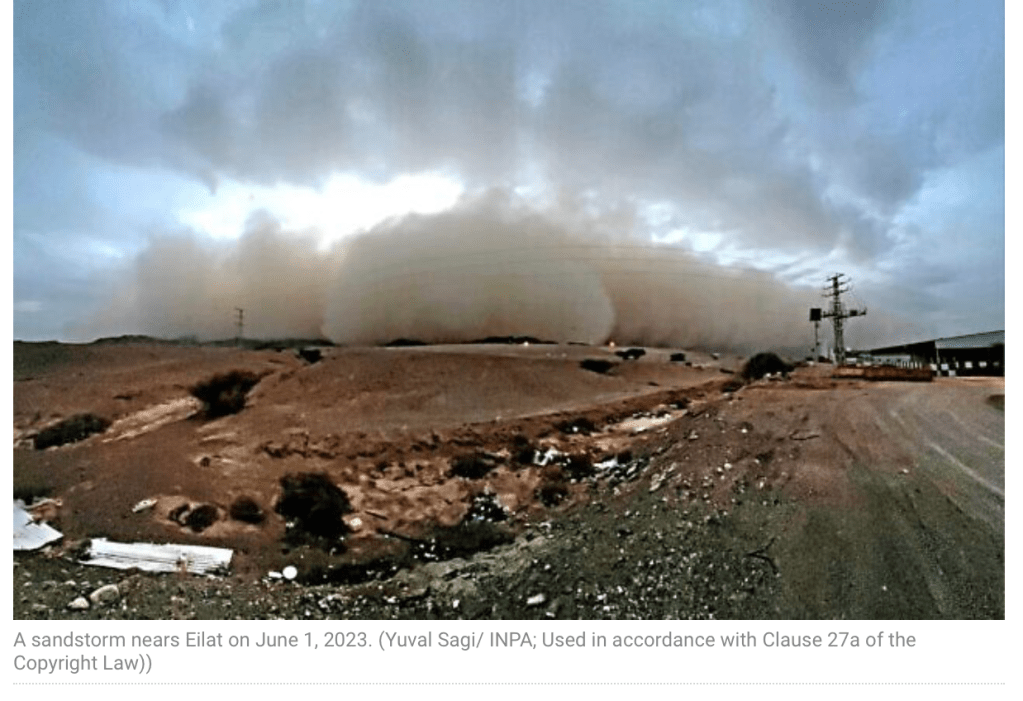 Sandstürme, aus Ägypten kommend, brachten nicht nur den Flugplan in Ramon und Ben Gurion durcheinander. Mit bis zu 100 km/h liess er Bäume und Baukräne umfallen und riss grosse Reklametafeln aus den Verankerungen. Verletzt wurde niemand. Menschen mit entsprechenden Vorerkrankungen wurden dringend aufgefordert, im Haus zu bleiben. Überhaupt solle man sich schonen und alle nicht notwendigen Outdoor-Tätigkeiten verschieben.