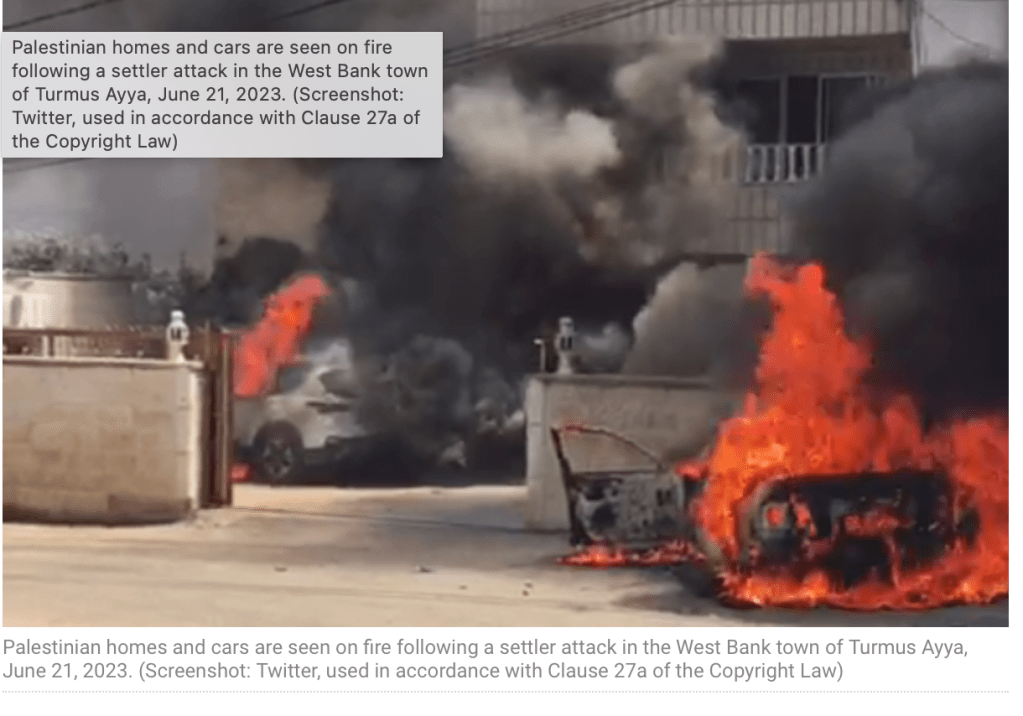 Nach der Beisetzung der vier Terroropfer stürmten Hunderte Siedler brandschatzend durch die palästinensische Stadt Turmus Ayya in der Nähe von Ramallah. Sie setzten wahllos Häuser, Autos und Felder in Brand und terrorisierten die Bevölkerung. Ein Palästinenser wurde getötet, drei weitere verletzt. Pressesprecher der PA beziffern den Schaden mit 60 Autos und 30 Häusern. Der Bürgermeister sprach von etwa 400 Siedlern, die an dem Anschlag beteiligt waren. Bisher gab es noch keine Kommentare seitens der IDF. Man muss es sagen, es war ein Pogrom. Und es war nicht das erste seiner Art.
