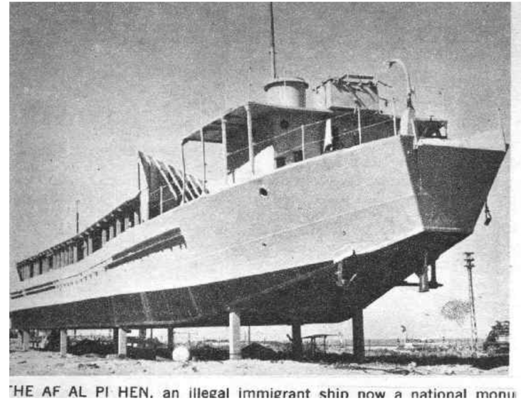 Das Wrack der Exodus sollte als Museumsschiff für die (illegale) Einwanderung nach Palästina umgebaut werden, brannte jedoch während der Arbeiten völlig aus und wurde vor Haifa versenkt.