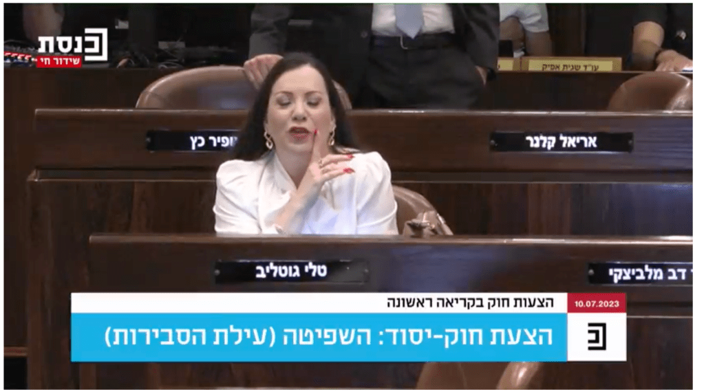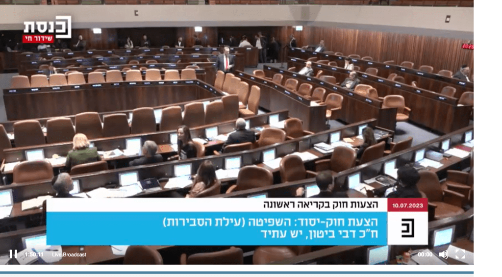 Um 18:30 Ortszeit begann die Diskussion über das Gesetz, das der Justiz das Recht, Entscheidungen der Knesset zu stornieren, entziehen soll. Nach einer kurzen Abstimmungszeit über andere Vorschläge begann dann die eigentliche Diskussion. Und die zieht und zieht sich. Mittlerweile ist es in Israel 23:08, der Plenarsaal ist fast leer obwohl sich noch 106 MKs in der Knesset aufhalten. Es wird wieder eine der typischen langen Sitzungs-Nächte. Die Abstimmung hat kurz vor Mitternacht stattgefunden und verlief wie erwartet: 64:56 Stimmen für die Annahme. Der Entwurf geht nun zurück an das Komitee und wird dann wohl noch in der kommenden Woche zur zweiten und dritten Lesung in der Knesset vorgelegt werden.