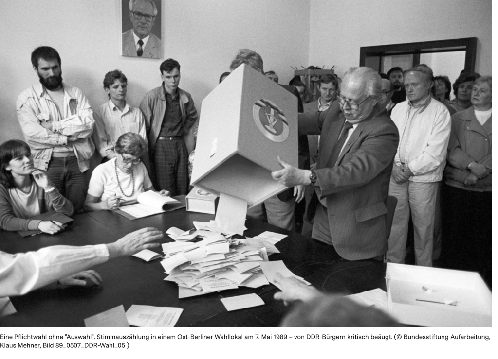 Ein letztes Aufbäumen der Politik gegen den Druck der Menschen ist die Fälschung der Kommunalwahlen am 7. Mai 1989. «Zettelfalten statt wählen», das war die Devise. Man nahm den Wahlzettel entgegen, faltete ihn einmal und warf ihn in die Wahlurne. Wer in die Wahlkabine ging, wurde fortan von der Stasi beäugt. Wer nicht zur Wahl ging, der wurde daheim besucht. 99% war in der Regel das Wahlergebnis. In den Nachbarländern herrschte bereits politisches Tauwetter. Michail Gorbatschow warb für «Glasnost und Perestroika». In Polen gab es Gespräche zwischen der verbotenen Untergrund-Gewerkschaft-Solidarność und der kommunistischen Führung.
