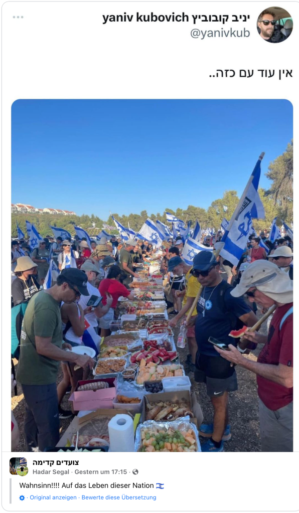 Es folgten die Demonstration am Dienstag, dem Tag, an dem jeweils die grossen Abstimmungen in der Knesset stattfinden. Zuletzt waren 400.000 (!) Menschen auf der Strasse.