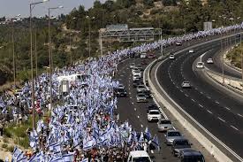 Manche kamen für einen Tag, manche liefen die ganze Strecke mit. Mehr als 10.000 waren es immer, gestern, am Samstag, wurden sogar 20.000 Teilnehmer geschätzt, die nach Jerusalem liefen. Bei den Teilnehmern waren Familien, Singles, Rollstuhlfahrer, ein Mann mit Krücken, Rollatoren. Man versuchte, die vielbefahrene Schnellstrasse Nr. 1 von Tel Aviv bis Jerusalem zu meiden. Wenn sich das nicht machen liess, lief der Demonstrationszug in geordneten 10-er Reihen. Die Polizei musste sich nicht bemühen, eine Fahrspur offen zu halten, die Demonstranten hielten sich daran, keine Provokationen aufkommen zu lassen. Es war ein Meer von unendlich vielen blau-weissen Fahnen, dass sich hinauf nach Jerusalem schlängelte.