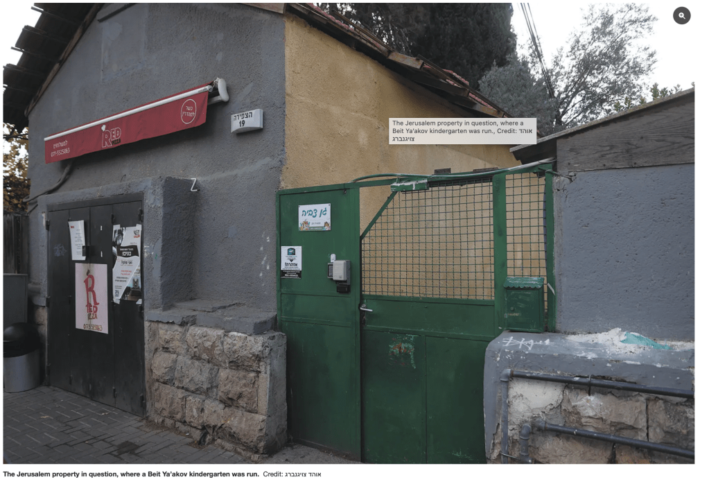 Nach dem Unabhängigkeitskrieg 1948 wurde das Gebäude von seinen ehemaligen palästinensischen Eigentümern enteignet und der Stadtverwaltung übergeben. Grundlage dafür war das «Absentee Property Law». Von der Stadtverwaltung erging das Nutzungsrecht an Yehuda Goldknopf, den damaligen Geschäftsführer der NGO, um dort einen Kindergarten zu betreiben und als geschützter Mieter anerkannt zu werden. Irgendwann wurde der Kindergarten geschlossen, das Grundstück blieb weiter im Mietrecht und wurde zur «Erwerbsimmobilie», aus deren Nutzung man ein Einkommen gewinnen konnte. Es entstand ein Rechtsstreit zwischen den ehemaligen palästinensischen Eigentümern, der Stadtverwaltung, einem neuen Bauträger, der das Objekt erwerben wollte, und der NGO, vertreten von Goldknopf Junior. Eine Einigung erfolgte mit der Überreichung eines Schecks in Höhe von US$ 371.000, um das Gebäude zu räumen.