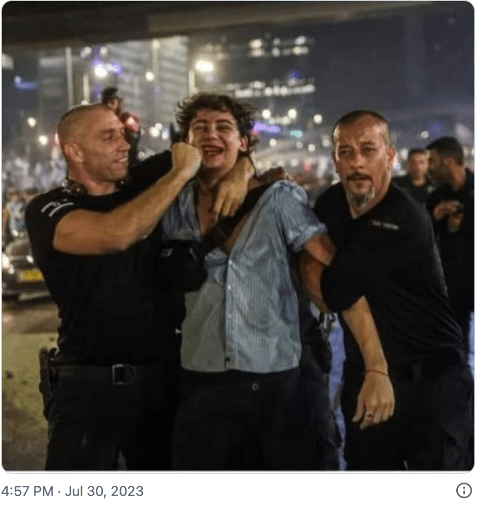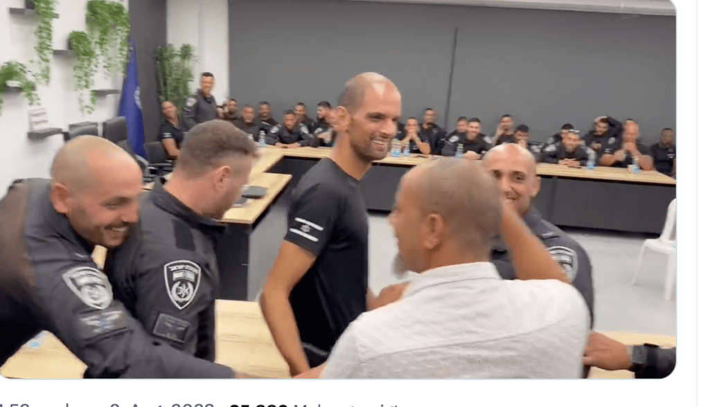 Shufshi, der Polizist der Amitai Aboudi, einen friedlichen Demonstranten heftig angriff, nachdem der schon mit Handschellen gefesselt war, wurde nach seiner Befragung mit Hurra-Rufen, Umarmungen und Küssen von seinen Kollegen begrüsst. Minister Ben-Gvir, der das Treffen kurzfristig anberaumt hatte, betonte nochmals, dass er voll und ganz hinter seinen Beamten stehe.