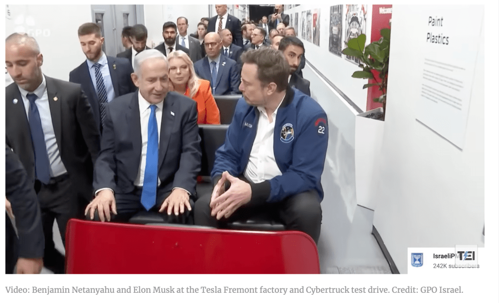 Zunächst war das Treffen mit Elon Musk angesagt. Fröhlich grinsend wie ein Bub, der beim Zusammenbau seiner Lieblingsautos zuschauen darf, erklärte er dem reichsten Mann der Welt sein Weltbild. Sarah sass da, ihr Miss Piggy Grinsen festgefroren im Gesicht. Die staunenden Gäste durften zunächst mit dem werkseigenen Bähnchen durch die Produktionshallen fahren, vorbei an vollautomatisierten Produktionsbereichen. Auch eine Probefahrt mit dem neuesten Fahrzeug aus dem Tesla Werk, dem FSD (Full-Self-Driving) Auto durfte er schon erleben, obwohl der noch in seiner Erlkönig-Montur steckt. Der Chef selbst zeigte auf der Teststrecke, was in seinem neuen «Space X» steckt. Zugegeben, Sarah sah nachher ein wenig mitgenommen aus … Ob es der israelischen, stark angeschlagenen Wirtschaft hilft?