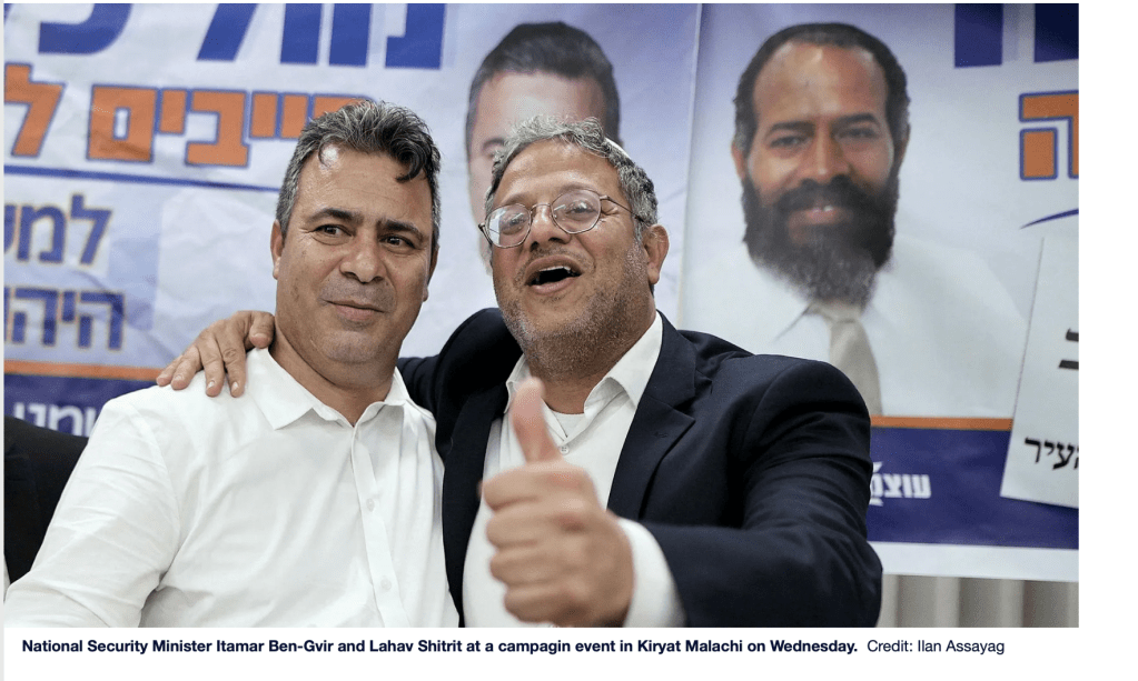 Eines der Videos zeigt Ben-Gvir zusammen mit seinem Favoriten: «Wir brauchen gefühlvolle Menschen wie Shitrit in Kiryat Malachi. Lahav Shatrit hat eine reine Seele … Meine Tür und die Tür von Otzma Yehudit stehen ihm immer offen. Lahav hat die DNA von Otzma Yehudit!»