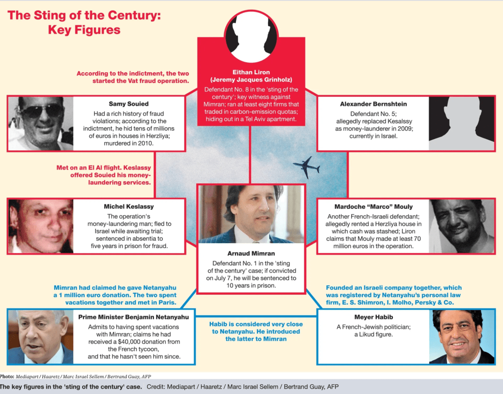 Die Anklage gegen Mimran wurde durch eine Aussage von Eithan Liron, aka Jeremy Jacques Grinholz, möglich. Mimran will Grinholz erstmals 2009 getroffen haben, als er in Israel war, um die Wiederwahl von Netanyahu zum PM zu feiern. Über die Rolle von Grinholz, will er nichts gewusst haben, bestätigt aber, ihm, «US$ 200.000 überwiesen zu haben.» Ein Sprecher von Netanyahu weist das natürlich weit von sich!