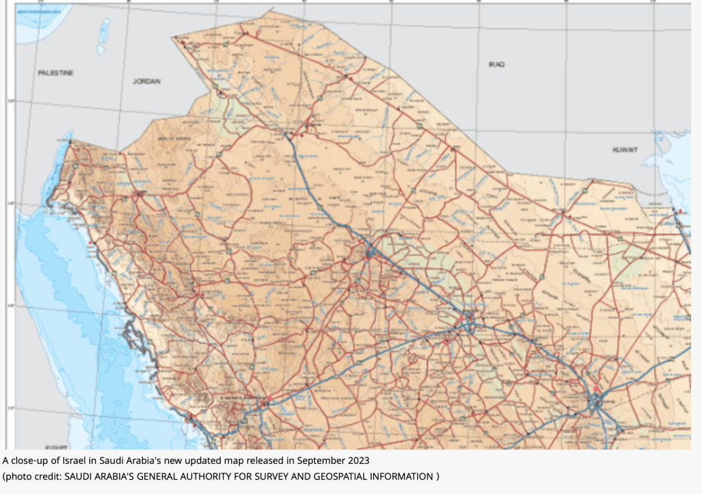 Israel regt sich zu Recht auf, wenn Saudi-Arabien auf seiner Webseite «Allgemeine Behörde für Vermessung und Geodaten» die neue Karte der «Internationalen Landgrenzen von Saudi-Arabien» veröffentlicht und Israel dabei zu Gunsten von Palästina unter den Tisch fällt.