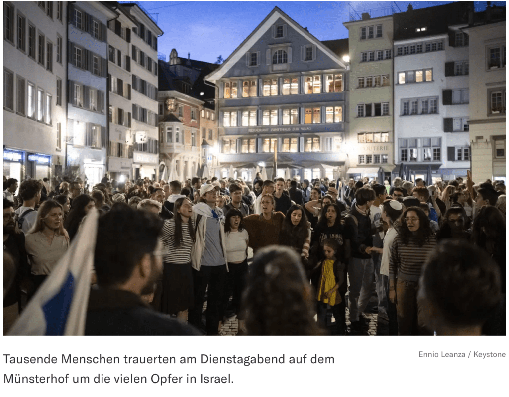 In Zürich fand gestern eine gutbesuchte Solidaritätsveranstaltung für Israel statt. Etwa 1.000 Menschen versammelten sich dort. Der Zürcher Regierungspräsident Mario Fehr kritisierte die «naive Schweizer Aussenpolitik» und sicherte nicht nur moralische, sondern auch finanzielle Unterstützung zu. «Wer Frauen vergewaltigt, alte Menschen tötet und Kinder entführt, ist kein Verhandlungspartner, sondern ein Terrorist.»