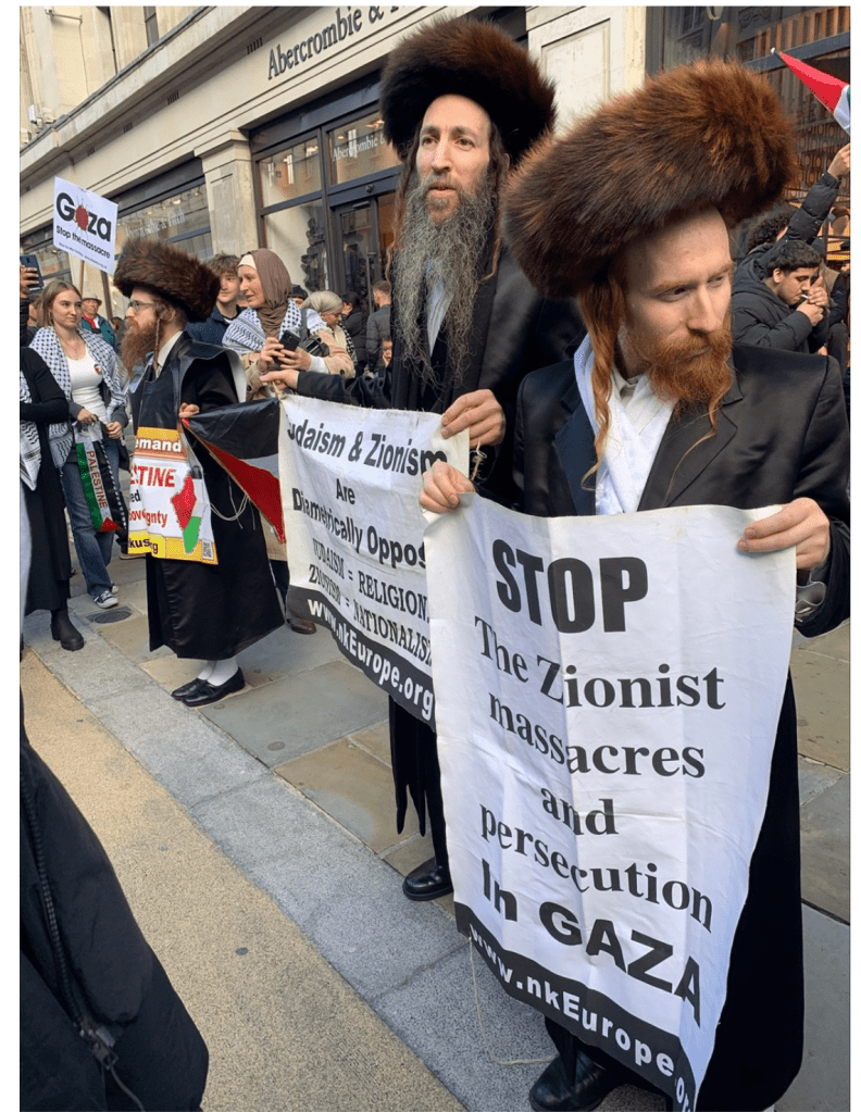 In London demonstrierten chassidische angebliche Rabbiner bei einem pro-Palästina Marsch dafür, das gesamte Gebiet zwischen dem Jordan und dem Meer wieder an die Palästinenser «zurückzugeben». Um den Shabbat nicht zu verletzten, wie sie festhielten, waren sie zu Fuss mehr als 5 Meilen gelaufen und hatten die Plakate an der Kleidung festgeklebt. Eine verachtenswerte Show, die mit Religion ganz und gar nichts zu tun hat! Sie waren nicht die einzigen Chassiden, die auf dem Piccadilly Circus an der Veranstaltung teilnahmen. Wie Sky news berichte, wurde noch eine weitere Gruppe unter den Teilnehmern gesichtet.