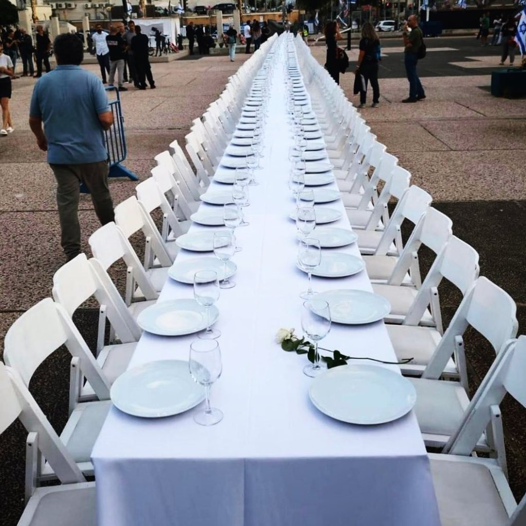 Am Freitagabend, wenn sich traditionell Freunde und Familie an einer festlichen Shabbat Tafel versammeln und gemeinsam festlich den Shabbat begehen, blieben in Tel Aviv 203 Stühle an einer langen Tafel unbesetzt. Jeder Platz war festlich eingedeckt. Challot, Wein und Blumen warteten auf die Gäste. Doch die kamen nicht. An jedem Stuhl war ein Schild befestigt, auf dem stand «Geisel». Die Installation trug den Namen «Der leere Shabbat-Tisch» und fand schnell Nachahmungen weltweit, darunter in den jüdischen Quartieren von Rom und Sydney.
