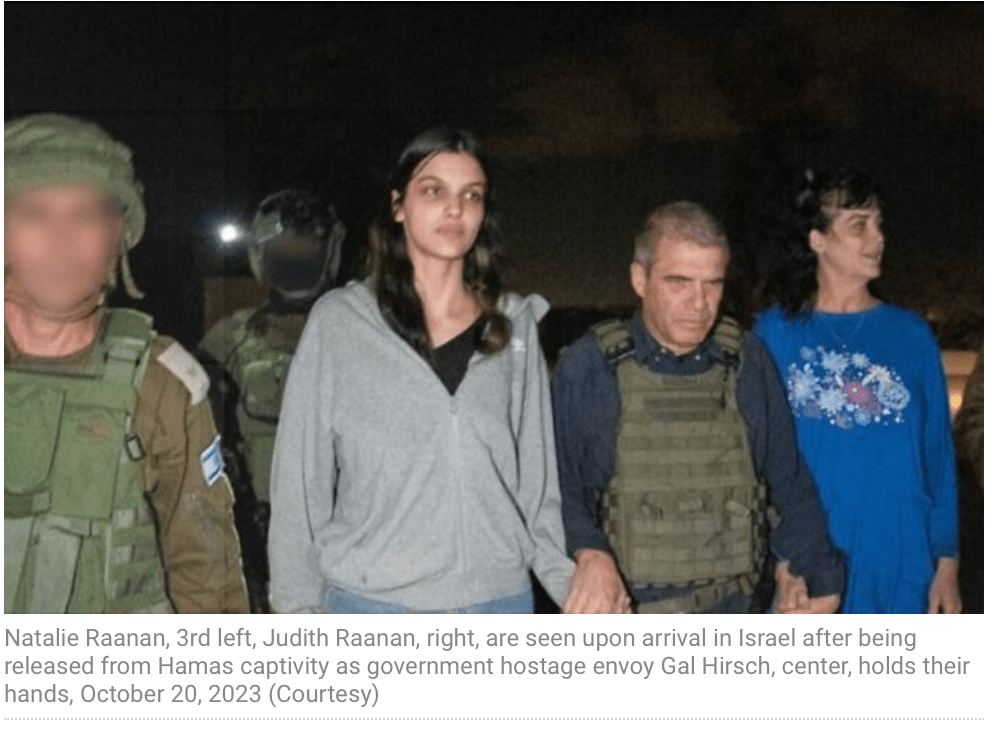 Gestern Abend kam auf einmal eine völlig unerwartete Information: Zwei Geiseln der Hamas-Terroristen, der Middle East Monitor nennt sie Widerstandsgruppe, sind frei! Nathalie und Judith Raanan wurden an der Grenze dem Roten Kreuz übergeben. Dieses brachte sie zurück nach Israel, um zu ihrer Familie zurückzukehren. Der Gesundheitszustand der beiden wurde vom Vater, mit dem sie unmittelbar nach der Freilassung telefonierten, als gut bezeichnet. Vom Kibbutz Nahal Oz, wo sie die Mutter von Judith besucht hatten, waren sie am 7. Oktober von den Terroristen entführt und nach Gaza verschleppt worden. Mutter und Tochter sind US-amerikanische Staatsbürger. Begleitet wurden sie bei ihrer Rückkehr von Brigade General Gal Hirsch, der vom PM als Koordinator für Geiseln und vermisste Personen eingesetzt worden war. Zunächst trafen sie mit ihrer Familie in einem Militärstützpunkt im Zentrum des Landes zusammen. Die Übergabe fand, so die Hamas, aus «humanitären Gründen» statt, wird von Israel jedoch als weiterer Schritt angesehen, durch gezielte Aktionen ihr Image positiv aufzupolieren. Die Hamas gab an, der Gesundheitszustand der Mutter sei der Grund für die Freilassung gewesen.