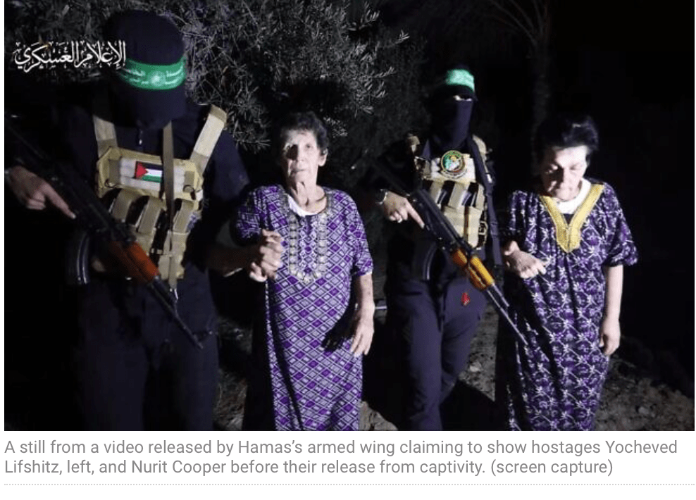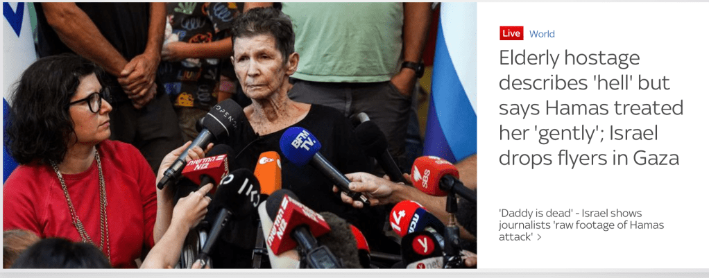 Yocheved Lifshitz, die auf einen Rollstuhl angewiesen ist, kann nur mit brüchiger Stimme erzählen. Äusserlich scheinbar gesund und unverletzt, sind die inneren Spuren der letzten Tage deutlich zu erkennen. Sie sei während der Fahrt in den Gazastreifen immer wieder mit Stöcken geschlagen worden. Die Entführer hätten sie in ein «Spinnennetz von Tunnels gebracht.» Bevor sie in den Tunnel gebracht wurden, habe man ihr den Schmuck und die Uhr abgenommen. Man habe sie gezwungen, sich zu Fuss quer durch ein Feld zu schleppen. Zunächst sei sie mit etwa 20 weiteren Geiseln in einem Raum gewesen, dann habe man sie zusammen mit drei weiteren abgesondert. Die Behandlung sei gut gewesen, man habe sie mit Medikamenten und Essen versorgt. «Jedem wurde eine Betreuungsperson zugeteilt, die gut auf uns aufpasste. Sie versorgten uns mit allem, was wir brauchten, sprachen mit uns über alles mögliche. Und die waren sehr freundlich.»