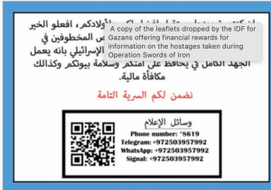 Die IDF hat Flugblätter über Gaza abgeworfen. Auf diesen werden die Palästinenser aufgefordert, alle Beobachtungen und Information zu den israelischen Geiseln an sie weiterzugeben. «Wenn ihr in Frieden zu leben und eine bessere Zukunft für eure Kinder haben wollt, dann teilt uns verifizierte und wertvolle Informationen über Geiseln mit, die in eurem Gebiet festgehalten werden. Das israelische Militär versichert euch, dass es maximale Anstrengungen unternehmen wird, um für eure Sicherheit und die eures Hauses zu sorgen. Ihr werdet eine finanzielle Belohnung erhalten. Wir garantieren euch absolute Vertraulichkeit.» In dem Flugblatt waren Telefonnummern aufgeführt, unter denen man sich mit Informationen melden konnte.