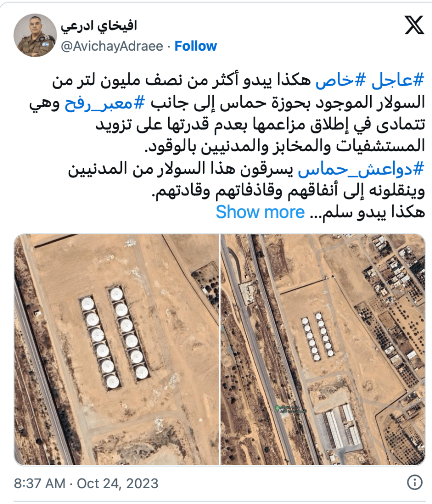 In den vergangenen Tagen wurden immer wieder mahnende Worte laut, dass die unterbrochene Treibstoffzufuhr in den Gazastreifen zu humanitären Katastrophen führen werde. Vor allem in den Krankenhäusern würden, so die Sprecher der Hamas-Terrororganisation «massenhaft Patienten sterben, weil sie nicht ordnungsgemäss behandelt und betreut werden können.» Nun sind in der Nähe des Grenzübergangs Raffah 12 Treibstofftanks mit einem Fassungsvermögen von etwa 500.000 lt Diesel entdeckt worden. Diese Entdeckung deckt sich in etwa mit Aussagen der UNRWA, die sich beklagte, dass von für sie bestimmten Lieferungen immer wieder grosse Mengen von der Hamas zu eigenen Zwecken gestohlen würden. Der Treibstoff würde für Tunnelanlagen, Abschussrampen und auch für den privaten Gebrauch der Terror-Führung genutzt.