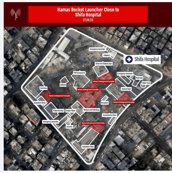 Eine der Hauptkommandozentralen der Hamas-Terror-Organisation wurden durch die IDF unterhalb des al-Shifa Hospitals in Gaza City lokalisiert. Der grösste medizinische Komplex des Gazastreifens liegt im modernen und auch mondänen Stadtteil Rimla, der eine Art Parallelwelt zum übrigen Gazastreifen ausmacht. Mit 1.500 Betten und mehr als 4.000 Mitarbeitern bietet das Spital nicht nur Behandlungen in allen medizinischen Fachgebieten. Es dient auch als Eingang zum weitverzweigten unterirdischen Tunnel Netzwerk und bietet unterhalb der einzelnen Gebäude Raum für perfekt geschützte Kommandoräume der Hamas, sowie gut getarnte Abschussrampen. Im Mitschnitt einer Unterhaltung bestätigt ein Sprecher, dass die Kommandozentralen der al-Qasam-Brigaden sich unterhalb des gesamten Geländes des Spitals befinden und dass die Israelis jetzt im Besitz der Pläne sind. Auf dem rot eingefärbten Plan erkennt man, dass die Kommandozentralen in der Nähe von Ambulatorien, der Pathologie, des Dialysezentrums und der internationalen Abteilung befinden.