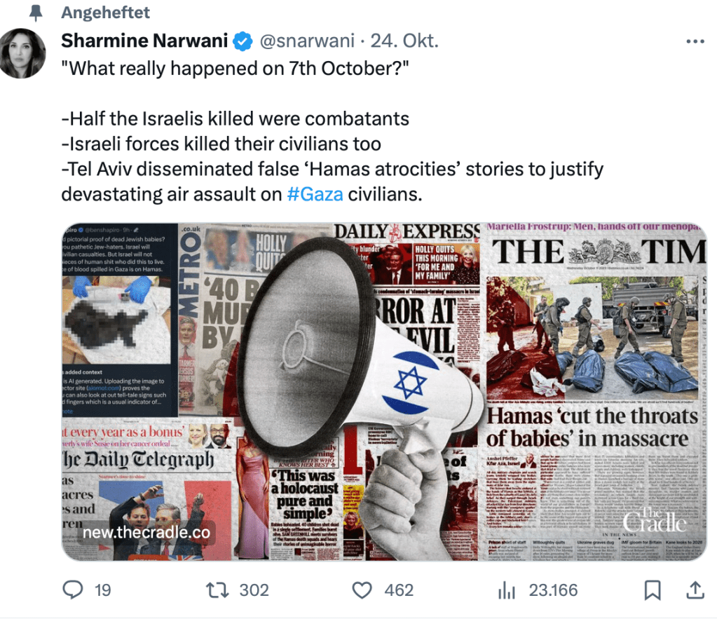 Während in den nördlichen Grenzorten Avimim, Margaliot und Misgav Am wieder die Sirenen schrillten, wurde bekannt, dass vom Iran unterstützte Einheiten von Syrien unterwegs in den südlichen Libanon sind, um dort die Hisbollah aktiv zu unterstützen. Das wurde von einem Arabisch sprechenden IDF-Sprecher bekanntgegeben. «Nach einer Reihe von Misserfolgen, die die Hisbollah in den letzten Wochen gegen Israel erlitten hat, ist die iranische Imam-Hussein-Brigade unter der Führung eines Kommandanten namens Zulfiqar im Südlibanon eingetroffen. Die Hisbollah und die Imam-Hussein-Brigade werden den Libanon einen hohen Preis zugunsten der Hamas-ISIS zahlen lassen. Die IDF sind voll und ganz darauf vorbereitet, auf jeden zu reagieren, der versucht, ihre Souveränität im Norden zu untergraben.» Diese Brigade besteht aus irakischen Schiiten, die einer Division der regulären syrischen Armee zugeteilt wurde und überwiegend aus der Region um Damaskus herum operiert. Befehligt wird die Brigade von Maher Assad, dem Buder des syrischen Diktators. Shamine Narwani, Kolumnistin des online anti-israelischen Schund-Blattes «The Cradle» dazu auf ihrem Twitter «X»-Account: «Das sind fake-news. Nichts dergleichen stimmt. Israel versucht, ein iranisches Element in sein Kriegs-Märchen zu bringe. Das ist gefährliche Propaganda.» Den unglaublichen Artikel kann man hier lesen.
