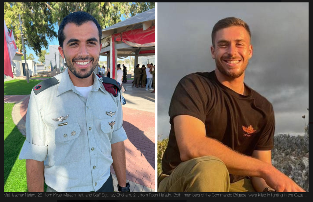 Wieder musste die IDF den Verlust von zwei Soldaten bekanntgeben. Es handelt sich dabei um Maj. Isachar Natan und Staff Sgt. Itay Shoham, s’’l. Die Zahl der gefallenen Soldaten erhöht sich damit seit Beginn der Bodenoffensive auf 44. Ein weiterer Soldat wurde bei seinem Einsatz schwer verletzt.