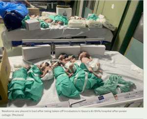 Das Shifa-Spital hätte schon längst wieder über unbedingt notwendige Diesellieferungen verfügen können, wenn nicht die Hamas Terror-Organisation dagegen wäre. So wurden 300 Liter Diesel, die von der IDF geliefert wurden, von der Hamas zurückgewiesen. In einer für die Soldaten unglaublich gefährlichen Operation wurden die Kanister aus Israel in gepanzerten Fahrzeugen in die Nähe des Shifa-Spitals gebracht. Von dort transportierten die Soldaten sie im Laufschritt bis zum Eingang des Gebäudes. Später erhielten sie jedoch die Information, dass die Hamas die Übernahme durch Mitarbeiter des Spitals verhindert hätten. Was mit dem Treibstoff weiter geschah, ist nicht bekannt. Das Shifa Spital wird derzeit immer noch von drei Seiten aus umkämpft, Israel bemüht sich, eine Seite für die sichere Evakuierung von Patienten und Zivilisten freizuhalten.