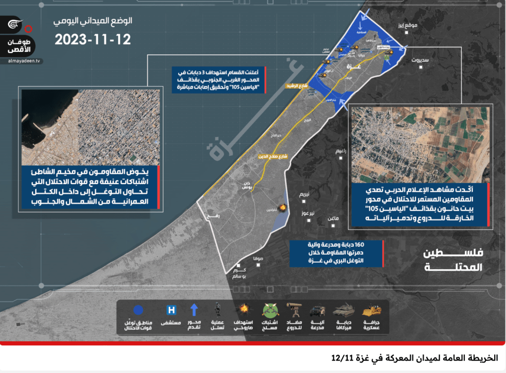 Auf der arabischen Seite heisst es zu einem Bild, das den Fluchtkorridor vom Shifa-Krankenhaus in den Süden und das umkämpfte Gebiet im Norden des Gazastreifens zeigt: «Zu einer Zeit, in der mit der zionistischen Propaganda verbundene Medien die Kontrolle der Besatzung über weite Gebiete der Westachse bis hin zur Kontrolle des Krankenhauses propagierten, bestätigen die Informationen, dass die Besatzung die Westseite der Nordachse noch nicht unter Kontrolle gebracht hat, aber in Längsrichtung von der Südseite in die Al-Rashid-Strasse eingedrungen ist. Sie erreichte den Abdel-Nasser-Kreisverkehr und bog um den Krankenhausplatz nach Westen in Richtung Al-Shati-Lager ab. Sie überquerte auch die Al-Nasr-Strasse von der Nordseite. Ankunft im Herzkrankenhaus, das etwa einen Kilometer vom Al-Shifa-Krankenhaus entfernt liegt.» Damit wird genau der Weg beschrieben, den die IDF für Patienten und Zivilisten freihält, um gefahrlos aus dem Gebiet des Shifa-Krankenhauses die nach Süden führende Hauptstrasse zu erreichen. Also eine ausschliesslich aus propagandistischen Gründen verdrehte Wahrheit, die den Beschuss durch die Hamas auf die Flüchtenden rechtfertigt.