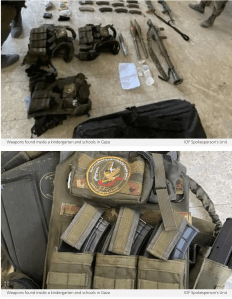 In einem Kindergarten und einer Grundschule im nördlichen Gazastreifen wurden von der IDF Waffenlager mit Granaten, Panzerabwehr-Waffen, Magazinen, Schutzwesten mit dem Emblem der Hamas, Sprengstoffgürtel gefunden und zerstört.
