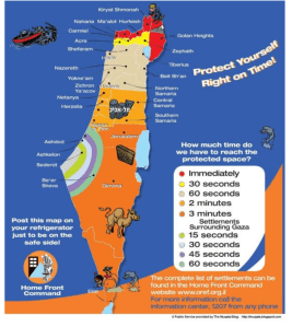 Vor wenigen Minuten wurde ein Haus in Sderot direkt von einer Rakete aus dem Gazastreifen getroffen. Sie hat gottseidank nur einigen Sachschaden angerichtet, verletzt wurde niemand. Hier nochmals zur Erinnerung, wie lange man in den einzelnen Regionen in Israel hat, um nach einem Alarm den nächsten Schutzraum aufzusuchen. Wie lebensrettend diese Schutzräume sind, zeigt der heutige Vorfall. Die Wände des Schutzraumes hielten der Rakete stand.