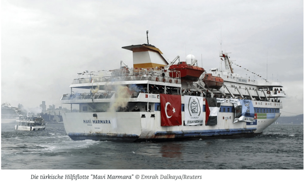 Im Hafen von Gaza stand seit einigen Jahren ein Denkmal zur Erinnerung an die Hamas-Unterstützer-Flotilla ‘Mavi Marmara’. Dieses Schiff war 2010 als Flaggschiff des «Ship-to-Gaza-Konvois» von der türkischen İHH İnsani Yardım Vakf (Stiftung für Menschenrechte, Freiheiten und humanitäre Hilfe) gechartert worden. Der IHH wird durchaus zu Recht eine ideologische Nähe zur Hamas, aber auch dem weltweiten Djihad, al-Qaida und den Taliban vorgeworfen. An Bord der insgesamt sechs Schiffe sollten sich neben 663 Palästinenserfreunden aus 37 Ländern, davon allein 400 türkische Bürger, auch etwa 10.000 (!) Tonnen an ‘Hilfsgütern’ befinden, die sich später bei einer Kontrolle durch das israelische Militär praktisch als unbrauchbar erwiesen. Israelische Quellen bezeichneten etwa 50 Aktivisten als Mitglieder internationaler Terrororganisationen. Ziel der Flotilla war es, die Blockade des Gazastreifens zu durchbrechen. Seitens der israelischen Regierung wurde mehrfach angeboten, nach Ashdod zu segeln und dort die ‘Hilfsgüter’ zu löschen. Sie würden auf dem Landweg in den Gazastreifen transportiert werden. Ein Angebot, das als ‘lächerlich und beleidigend’ abgelehnt wurde. Ein Funkspruch der IDF, in dem das Angebot an die Aktivisten wiederholt wurde, wurde mit einem höhnischen «Go back to Auschwitz» quittiert. In der Nacht vom 31. Mai auf den 1. Juni 2010 umzingelten israelische Schiffe die Flotilla und begannen damit, die Schiffe zu entern. Doch dann eskalierte die Operation. Es gab Tote und es gab Verletzte, auf beiden Seiten. Für die Türkei war die Mavi Marmara ein Grund, die diplomatischen Beziehungen zu Israel auf Eis zu legen. Erst sechs Jahre später und nachdem Israel unter PM Netanyahu der Türkei eine Kompensationszahlung in Höhe von US$ 20 Millionen gezahlt hatte, wurden diese Beziehungen wieder aufgenommen. Jetzt liegen sie wieder auf Eis. Vorgestern wurde das Denkmal im Hafen von Gaza gesprengt.