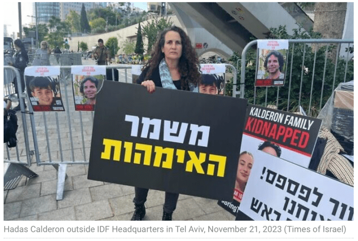 Die Mutter zweier Geiseln, Hadas Calderon, demonstriert derzeit vor dem Eingang des Hauptquartiers der IDF in Tel Aviv, Kirya. Ihre beiden Kinder, Erez, 12, und Sahar, 16, wurden am 7. Oktober zusammen mit ihrem Vater Ofer in den Gazastreifen verschleppt. «Ich fordere alle betroffenen Mütter auf, hierher zu kommen, und gemeinsam mit mir zu demonstrieren. Wir dürfen diese Chance der Befreiung der Geiseln gegen einen Austausch von Gefangenen nicht ungenutzt vergehen lassen. Wir müssen alles tun, um sie heimzuholen!» Geplant ist offensichtlich, Kinder mit ihren Müttern und andere Frauen freizulassen.