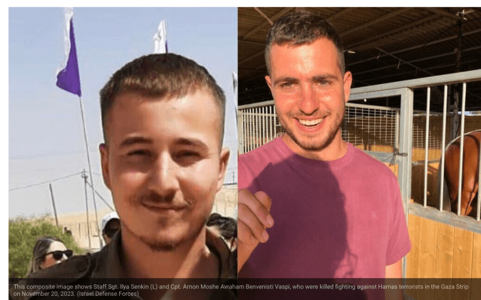 Wieder verloren zwei Soldaten ihr Leben im Kampf im nördlichen Gazastreifen. Cpt. (res) Arnon Moshe Avraham Benevisti Vaspi, 26, und Staff Sgt. Ilya Senkin, 20, s’’l. Während der Operation wurden fünf weitere Soldaten schwer verletzt. Die Zahl der während der Bodenoffensive gefallenen Soldaten beträgt 68.