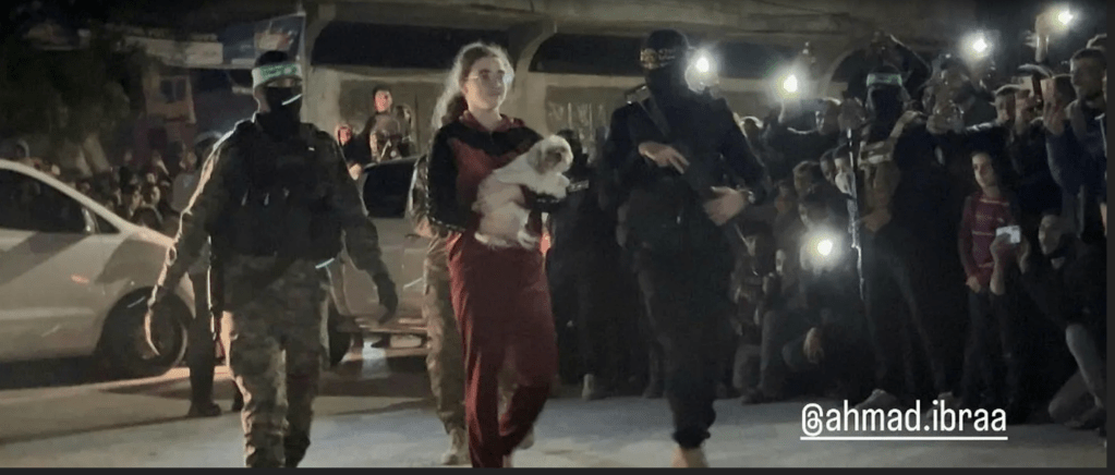 Bei der gestrigen Übergabe der freigelassenen Geiseln an das IRK war eine Änderung zu beobachten. Neben den Terroristen der Hamas, erkennbar an den grünen Stirnbinden, nahmen auch erstmals Terroristen des Palästinensischen Islamischen Djihad, erkennbar an den schwarzen Stirnbinden teil. Die ‘Parade’ der Geiseln war eine letzte Erniedrigung vor der Freilassung und die Demonstration von Sadismus und menschenverachtendem Verhalten. Hier das Video.