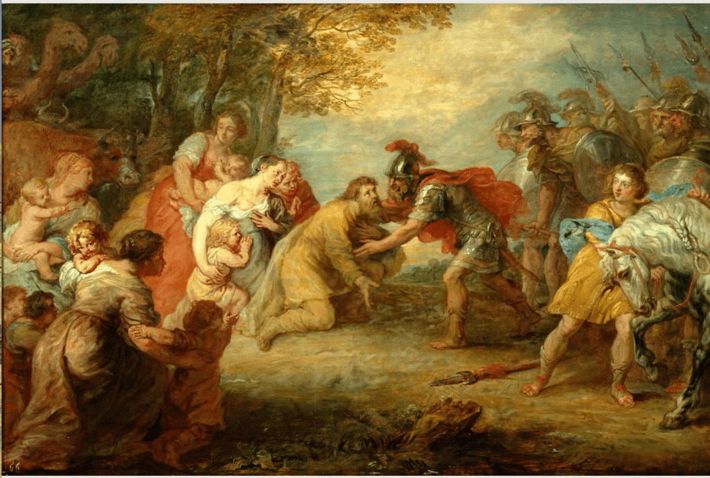 Weiter dürfen wir an der Lebensgeschichte von Jakob teilnehmen. Seit der Verabschiedung von seinem Schwiegervater Laban ist er nun allein mit seiner Familie unterwegs auf dem Weg nach Hause. Er wusste, dieser Weg würde unausweichlich ein Zusammentreffen mit seinem Bruder Esau bedeuten, der nach wie vor in Edom lebte. Ganz wohl ist ihm dabei nicht und so schickt er Knechte aus, seinem Bruder von ihm als ‘seinem Knecht’ zu berichten. Gottes Wege sind nie ein Zufall, und so erstaunt es auch nicht, dass die Knechte mit der Nachricht zurückkamen, Esau befinde sich bereits auf dem Weg ihm, Jakob, entgegen. Jakob geriet in Panik, er teilte seinen gesamten Besitz in zwei gleichgrosse Teile. Damit wollte er einen Teil retten, falls Esau ihn angreifen und sein Lager zerstören würde. Sogar ein grosszügiges Geschenk stellte er für seinen Bruder zusammen, eine grosse Viehherde, die er mit seinen Knechten losschickte. «Sagt ihm sie kommen von deinem Knecht Jakob, der dort hinter uns dir entgegenzieht.» Am nächsten Tag brachte Jakob seinen restlichen Besitz, sowie seine Familie auf der anderen Seite des Flusses in Sicherheit. Nachdem er zurückgekehrt war, trat ein Mann auf ihn zu und versuchte, ihn niederzuringen. Das gelang ihm aber nicht und so schlug er ihn auf die Hüfte. Der Hüftknochen sprang aus dem Gelenk. Dann geschieht etwas, was wir nicht interpretieren können. Als Morgendämmerung heraufzog, bat der Mann Jakob, ihn loszulassen, der aber forderte ihn auf «Ich lasse dich erst los, wenn du mich segnest.» Und der Mann frug ihn um seinen Namen: «Nicht mehr Jakob wird man dich nennen, sondern Israel (Gottesstreiter); denn mit Gott und Menschen hast du gestritten und hast gewonnen» und segnete ihn. Jakob ist erstaunt, das Treffen mit Gott überlebt zu haben. Jetzt steht er dem Treffen mit seinem Bruder etwas positiver gegenüber, Doch Esau ist selbstbewusst geworden in den Jahren. „Ich habe genug, Bruder, behalte nur, was dir gehört.“