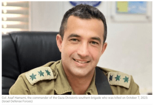 Gestern musste die IDF bekanntgeben, dass der Kommandant der südlichen Gaza Brigade, Col. Asaf Hamami, 41, s’’l, am 7. Oktober bei der Verteidigung vom Kibbutz Nirim ermordet wurde. Seine sterblichen Überreste wurden nach Gaza verschleppt und befinden sich nach wie vor in den Händen der Hamas Terror-Organisation. Sein Tod war der IDF schon länger bekannt, wurde aber aus Sicherheitsgründen erst jetzt bekanntgegeben. Das Militärrabbinat identifizierte ihn anhand von aufgefundenen Gegenständen aus seinem Besitz.