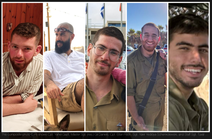 Die IDF musste auch heute wieder den Tod von fünf Soldaten bekanntgeben. Sgt. Yakir Yedidya Schenkolewski, 21, Sgt. Eitan Fisch, 23, und Staff Sgt. Tuval Yaacov Tsanani, 20, s’’l. Im gleichen Gefecht im nördlichen Gazastreifen wurden vier weitere Soldaten schwer verletzt. Am Mittag wurde der Tod von zwei weiteren Soldaten, Cpt. Yahel Gazit, 21 und Master Sgt. (res) Gil Daniels, 34, s’ll, bekannt. Die Zahl der Gefallen erhöht sich damit auf 80 seit Beginn der Bodenoffensive.