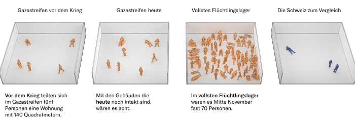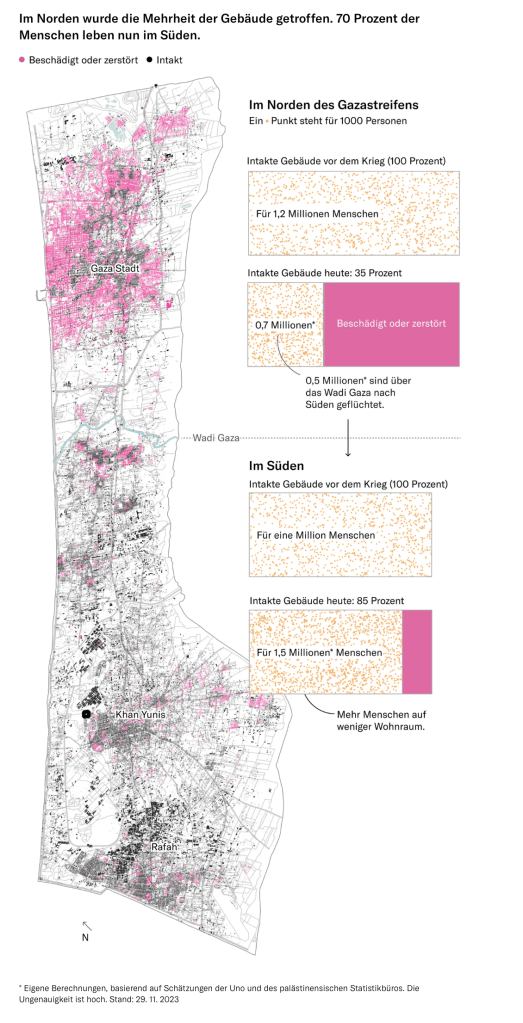 Ungeachtet der klaren Aufforderungen der IDF, dass sich die Bewohner bestimmter Regionen über speziell eingerichtete und bezeichnete ‘sichere Strassen’ in ‘sichere Regionen’ begeben sollen und die IDF sich verpflichtet, diese Wege zu schützen, hat die UN Bedenken angemeldet. Der Sprecher des UNO Kinderhilfswerks, UNICEF, James Elder, richtete sich per Video-Botschaft aus Kairo an die Presse in Genf: «Die sogenannten ‘sicheren Zonen’ sind nicht realistisch, nicht vernünftig, sie sind nicht möglich, und ich denke, die Behörden sind sich dessen bewusst.» Kritik ist immer gut, wenn sie konstruktiv ist und Alternativen enthält. Die fehlen hier, wie bei fast allen, die glauben, sie hätten die Kriegsweisheit mit der Muttermilch eingesogen. Ein bedrückendes Szenario zeigt die heutige NZZ auf.